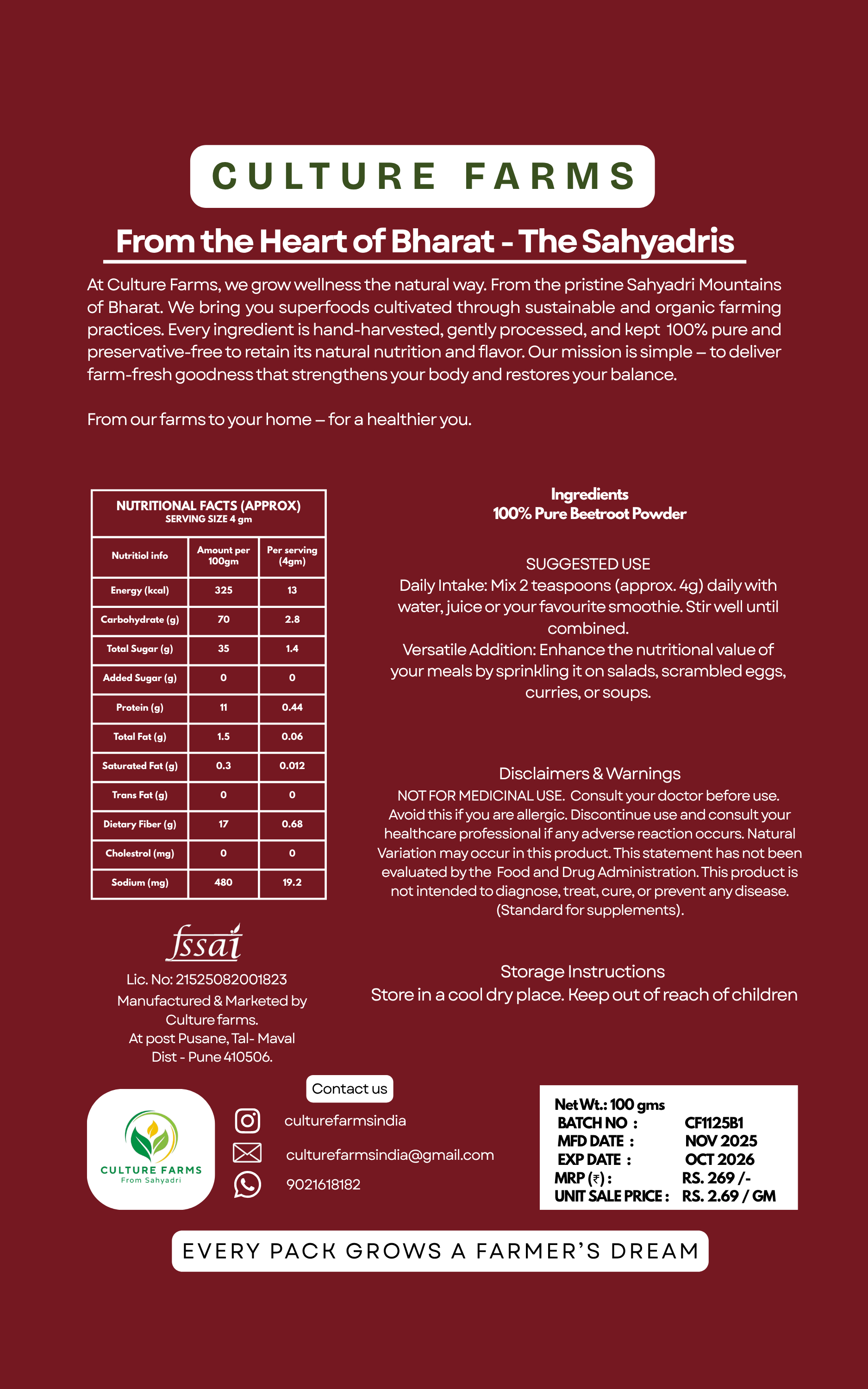 Made from fresh, farm-grown beetroots, this powder is rich in iron and nitrates that boost stamina and promote heart health. Ideal for smoothies, juices, or natural food coloring.
